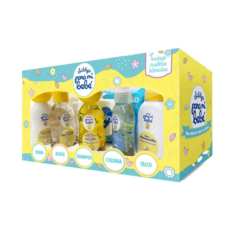 El set incluye: Crema, Aceite, Shampoo, Colonia, Talco, Pañito Húmedo.