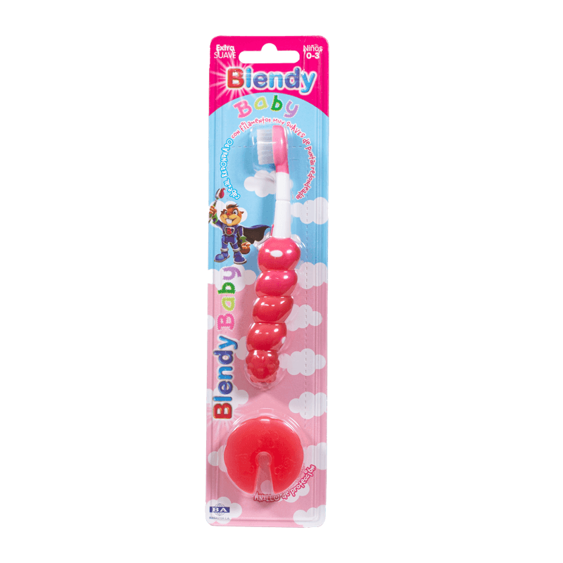 Cepillo dental pediátrico elaborado con cerdas extra suaves de puntas redondeadas para evitar daños en las encías del bebé. Cabeza pequeña y mango ergonómico. Contiene anillo de protección que evita el ingreso el cepillo de manera brusca en la cavidad bucal durante su uso.