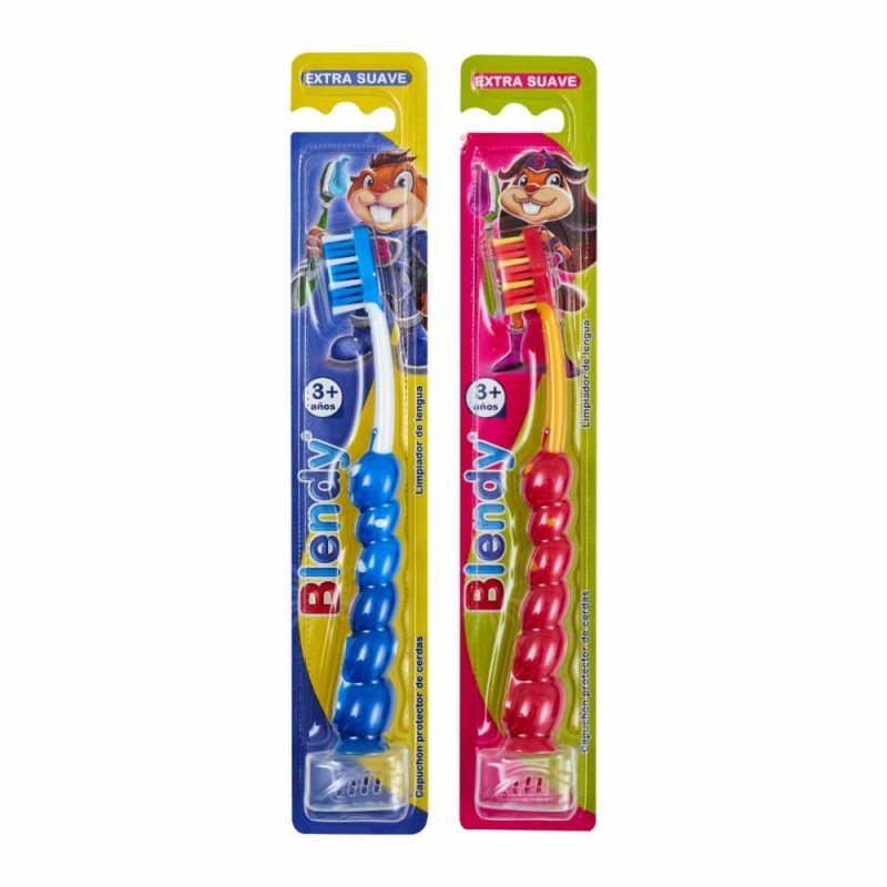Cepillo dental infantil elaborado con cerdas extras suaves y puntas redondeadas y pulidas. Cabeza anatómica para acceder con facilidad a las zonas más difíciles. Limpiador de lengua. Capuchón protector de cerdas.