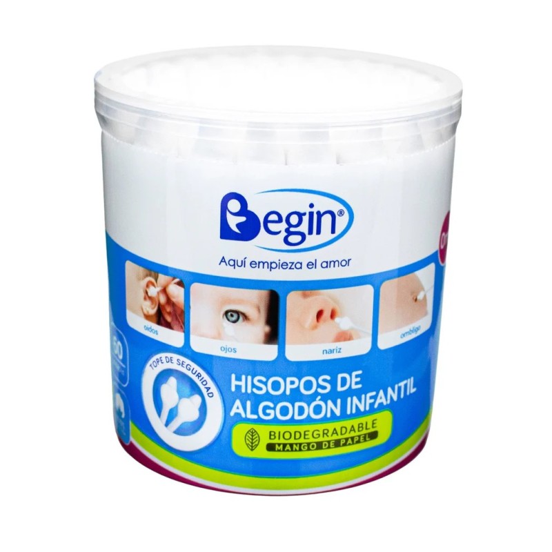 Hisopo biodegradable Begin con diseño de punta especial con tope de seguridad, para poder limpiar zonas delicadas de nuestros bebés como ojos, oídos, nariz y ombligo.
