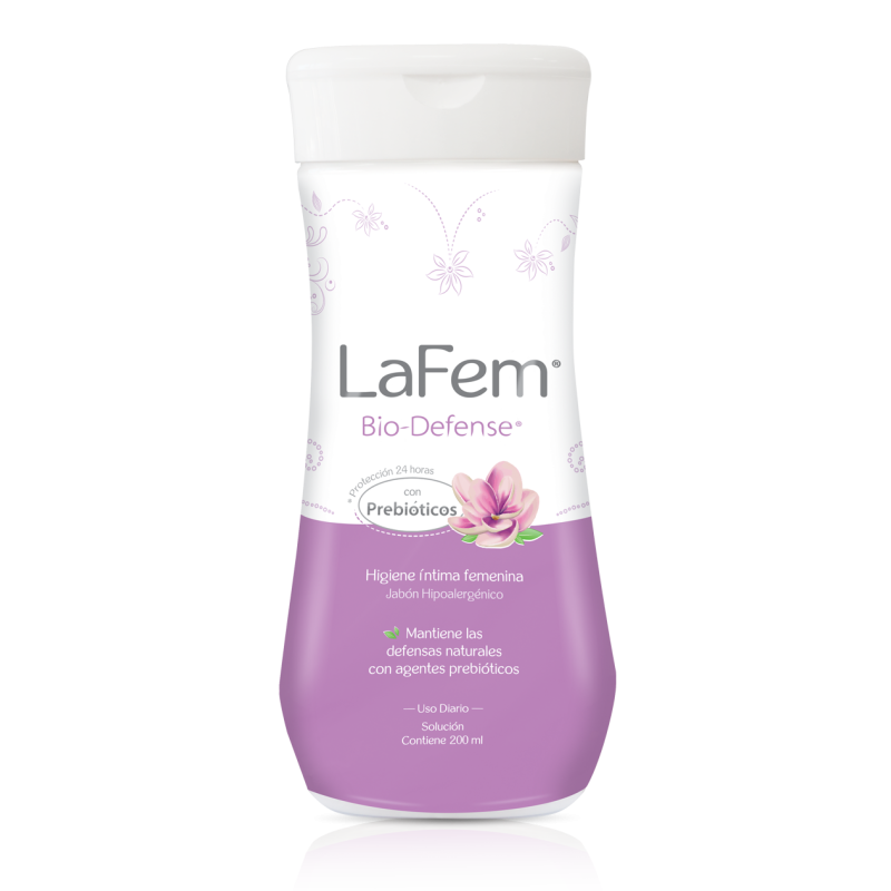 Mantiene el pH normal de la zona íntima femenina sin perjudicar las defensas naturales. La fórmula de LaFem Bio-Defense es hipoalergénica y ha sido desarrollada para disminuir el riesgo de irritaciones y olores. Contiene Alpha-glucan oligosaccharide y ácido láctico.