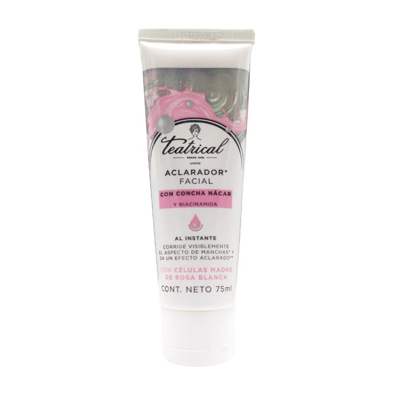 Teatrical Aclaradora Facial 75 ml, con células madre de rosa blanca, extracto de concha nácar y niacinamida.