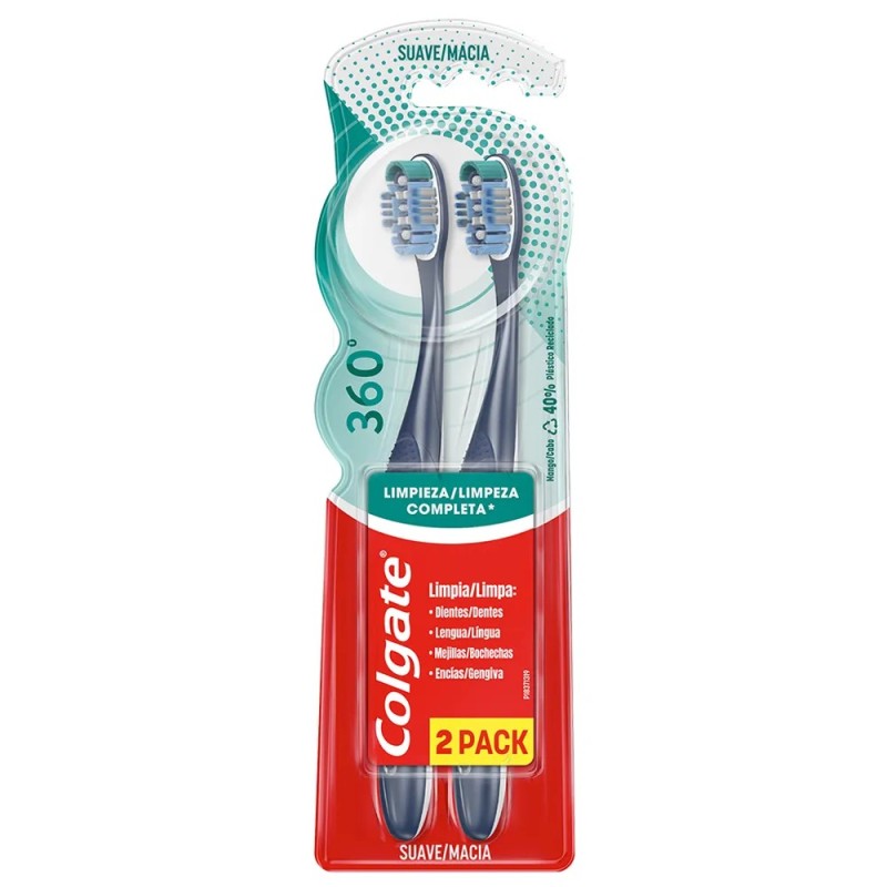 Consigue una limpieza oral completa utilizando la suavidad del Cepillo Dental 360° Suave que Colgate trae para ti en un empaque con dos Unidades. Con su sofisticado diseño es capaz de eliminar hasta 151% más de bacterias que se encuentran en la superficie de la boca porque sus cerdas al ser más suaves, te permiten realizar movimientos más firmes sin lastimar la superficie dental. Igualmente, cuenta con un limpiador de lengua y mejillas en la parte posterior de la cabeza
