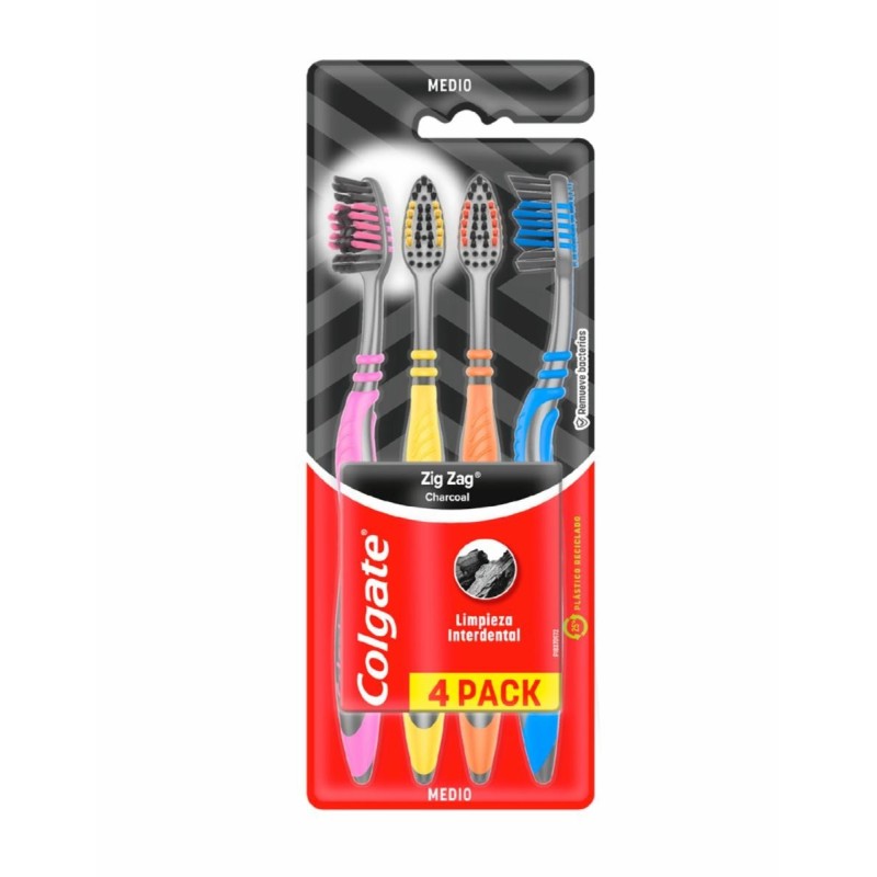 - Cepillo Zig Zag x4 con cerdas con infusión de carbón que eliminan la placa bacteriana en la superficie del diente.