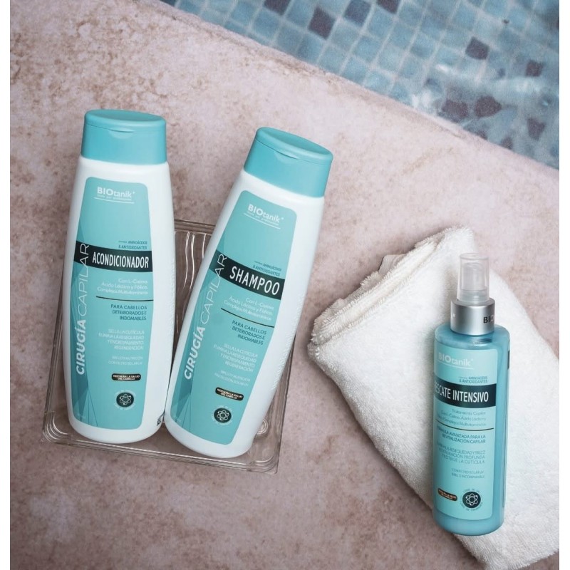 La Cirugía Capilar, línea de cuidado, reparación y mantenimiento de Biotanik está indicada para cabellos dañados, muy frizados e indomables que hayan sido maltratados por el uso excesivo de la plancha, secador y por procesos de Alisado brasilero, japonés y Botox capilar
