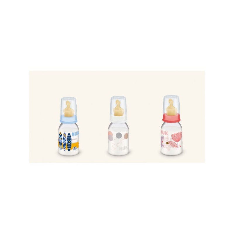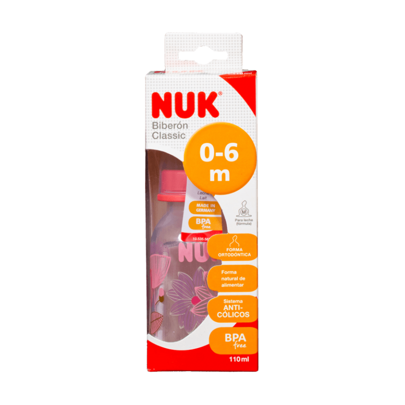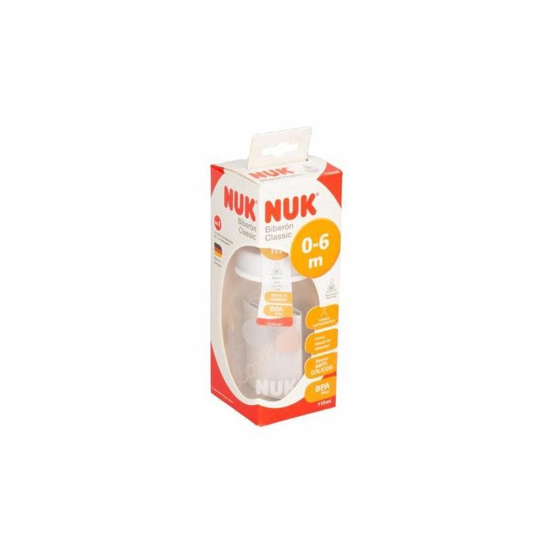 Biberón Classic de 110 ml con tetina de látex para bebés de 0 a 6 meses de edad con forma anatómica exclusiva que se adapta perfectamente a la mandíbula del bebé. Con Orificio Medio. Con sistema de ventilación NUK ANTI COLIC AIR SYSTEM mejorado que ayuda a prevenir los cólicos.