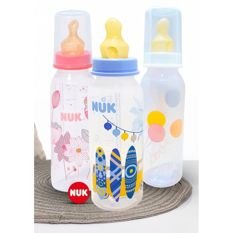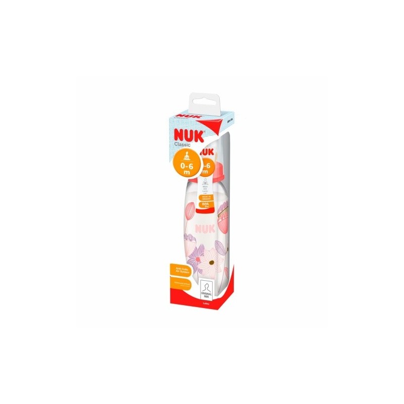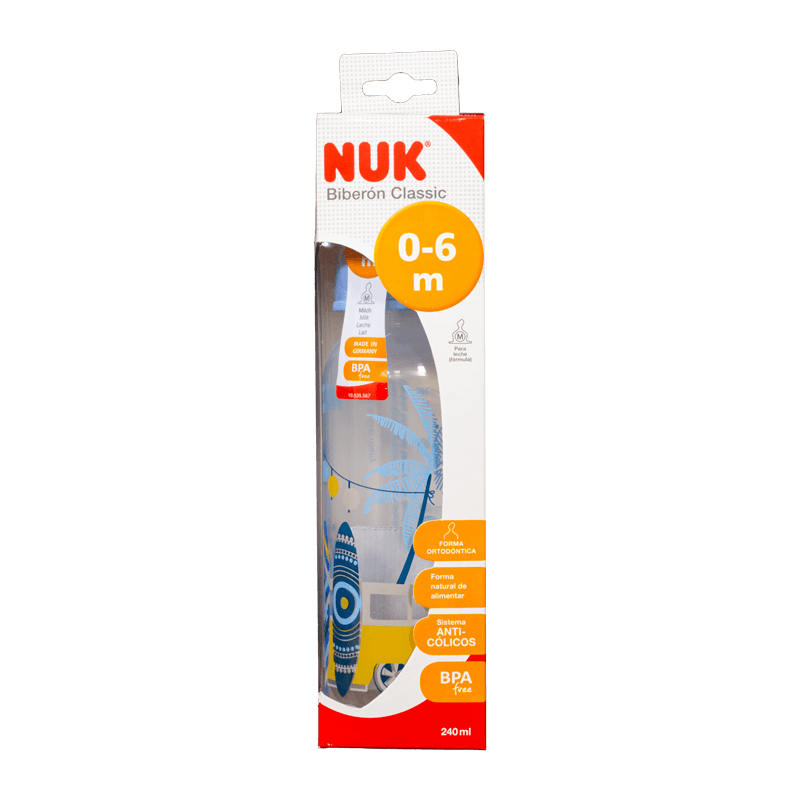 Biberón Classic de 240 ml con tetina de látex para bebés de 0 a 6 meses de edad con forma anatómica exclusiva que se adapta perfectamente a la mandíbula del bebé. Con Orificio Medio. Con sistema de ventilación NUK ANTI COLIC AIR SYSTEM mejorado que ayuda a prevenir los cólicos.