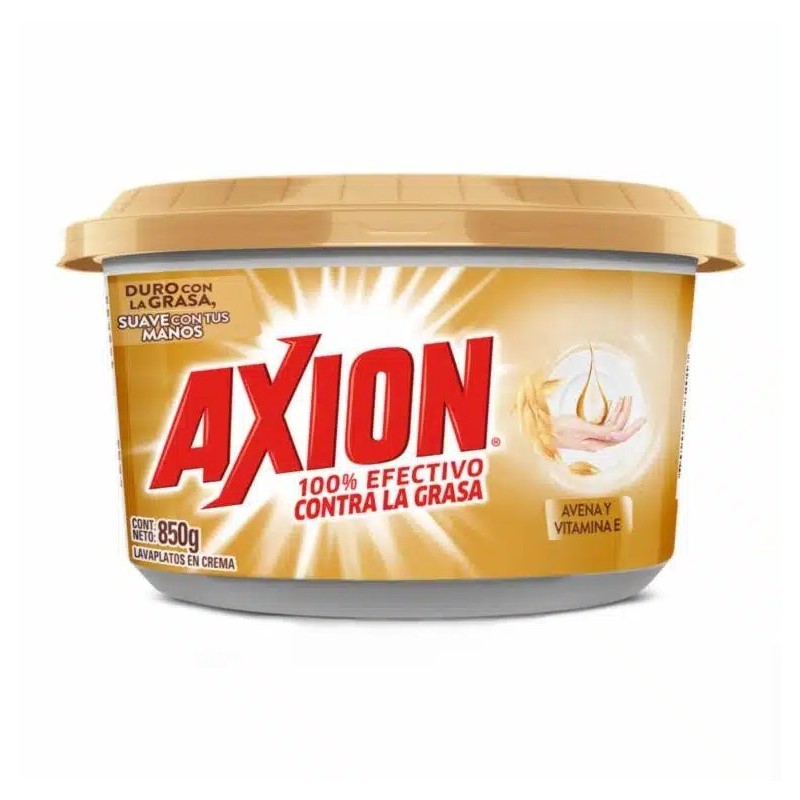 Conoce Axion® Toque de Crema con Avena y Vitamina E su fórmula es suave con tus manos mientras elimina la grasa más pegada de tus utensilios.