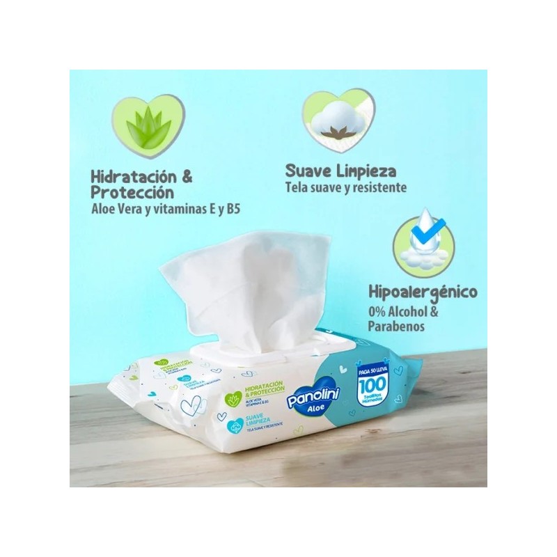 Las toallitas húmedas de Panolini Aloe protegen e hidratan profundamente la piel tu bebé, gracias a su exclusiva fórmula con extracto natural de Aloe Vera, Vitaminas E & B5, manteniendo su piel suave y aliviada con una sensación de limpieza refrescante.