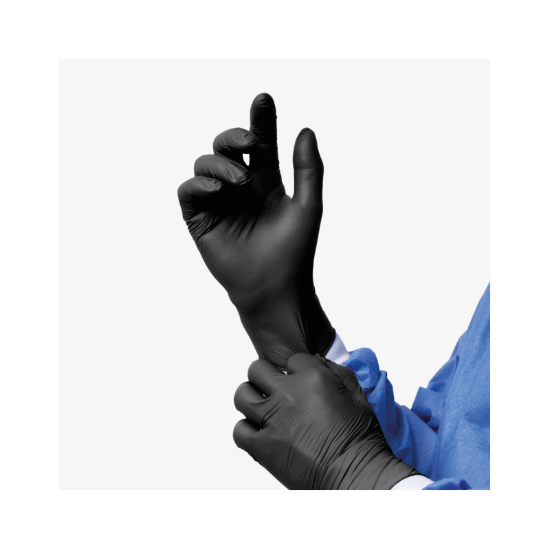De nitrilo negro, ambidiestro, hipo alergénico, con reborde, no estéril, descartable.